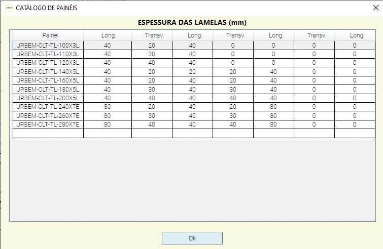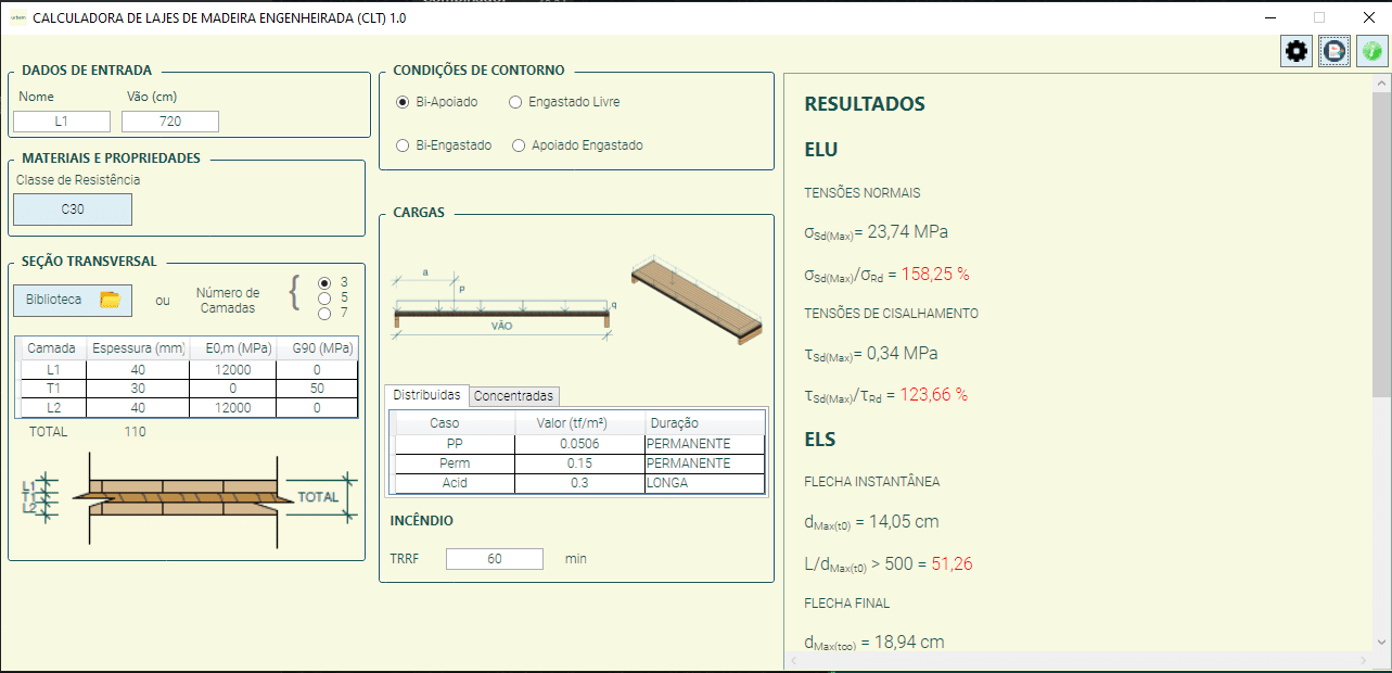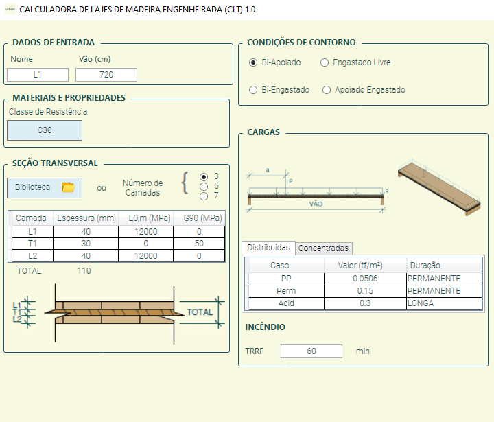 Em sua atual versão, a “Calcula Timber CLT” verifica painéis de CLT compostos por 3, 5 e 7 lamelas de madeira posicionadas perpendicularmente entre si. O usuário conta com uma biblioteca com todas as seções transversais de painéis disponibilizadas no mercado pela Urbem e pode também criar suas próprias configurações e painéis. Com ela, é possível realizar cálculo e verificação de:
