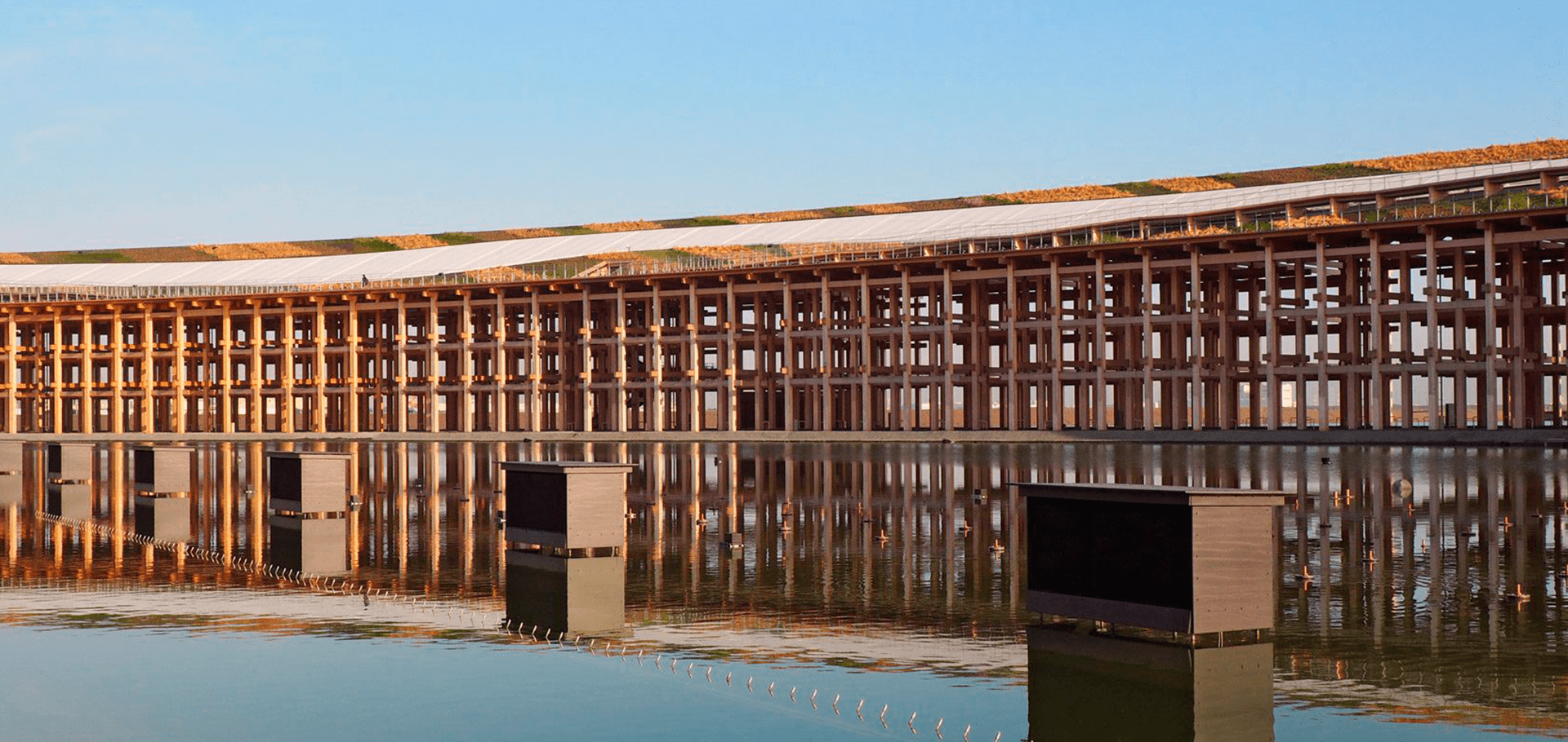 A primeira grande impressão ao caminhar pela Expo Osaka é o protagonismo da madeira engenheirada. O centro do evento é marcado por uma estrutura monumental projetada por Sou Fujimoto — um anel de 61 mil m² construído com madeiras japonesas, usando técnicas tradicionais de encaixe. É hoje a maior estrutura de madeira do mundo — e será desmontada e reutilizada ao final da exposição.