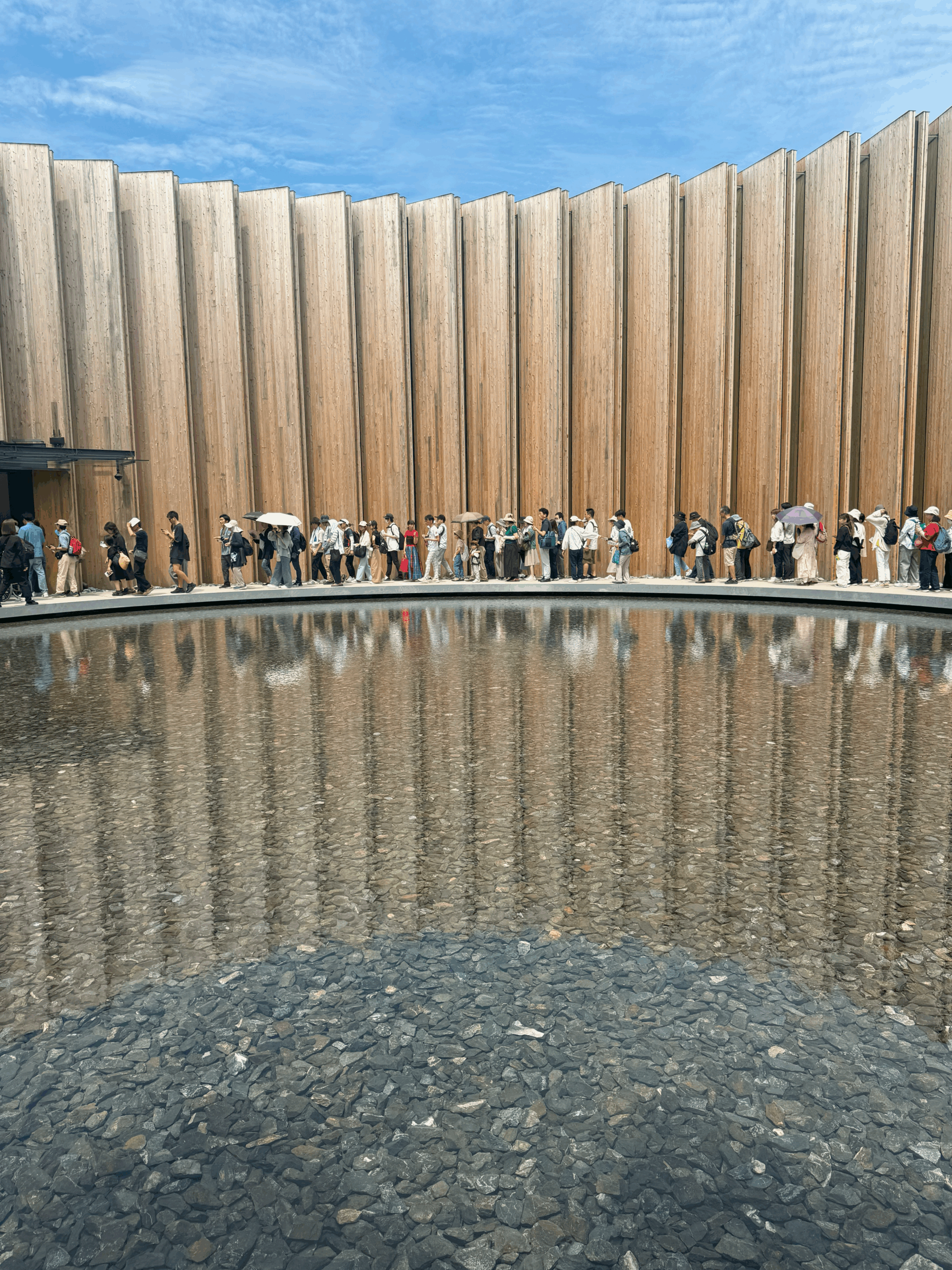 Projetado por Oki Sato (Nendo) e pelo escritório Nikken Sekkei, o pavilhão japonês explora o tema “Between Lives”, refletindo a convivência entre seres, ecossistemas, tempo e tecnologia. Sua estrutura circular de CLT (cross-laminated timber), feita com ripas verticais de madeira, remete à fluidez e aos ciclos da natureza. A experiência é dividida em três fases: Plant, que conecta o visitante ao mundo vegetal por meio de projeções imersivas e sons orgânicos; Farm, que valoriza o conhecimento agrícola ancestral japonês e os vínculos entre alimento, cultura e território; e Factory, onde tecnologias e técnicas tradicionais — como os encaixes em madeira sem pregos — se encontram para projetar um futuro que respeita o passado.