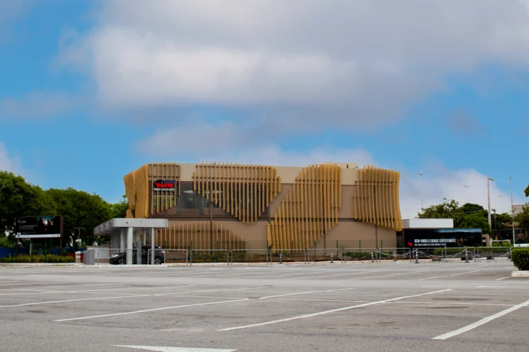 Detalhe estrutural de vigas em GLULAM (Madeira Laminada Colada) no Open Mall Praça Pitiguari.