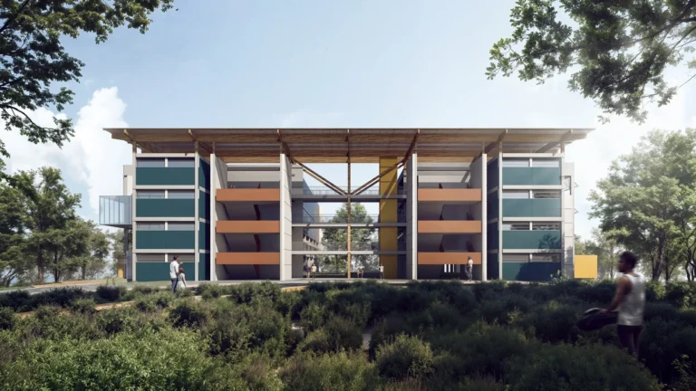 Imagem 3D do Arvoredo evidenciando uso de madeira laminada colada em ambiente urbano.