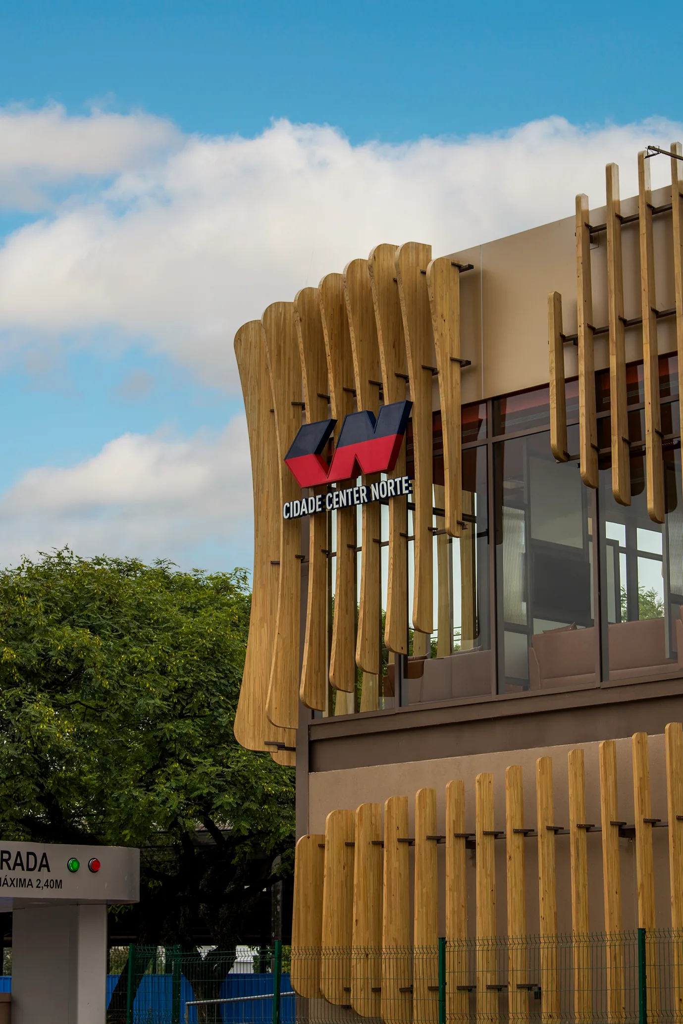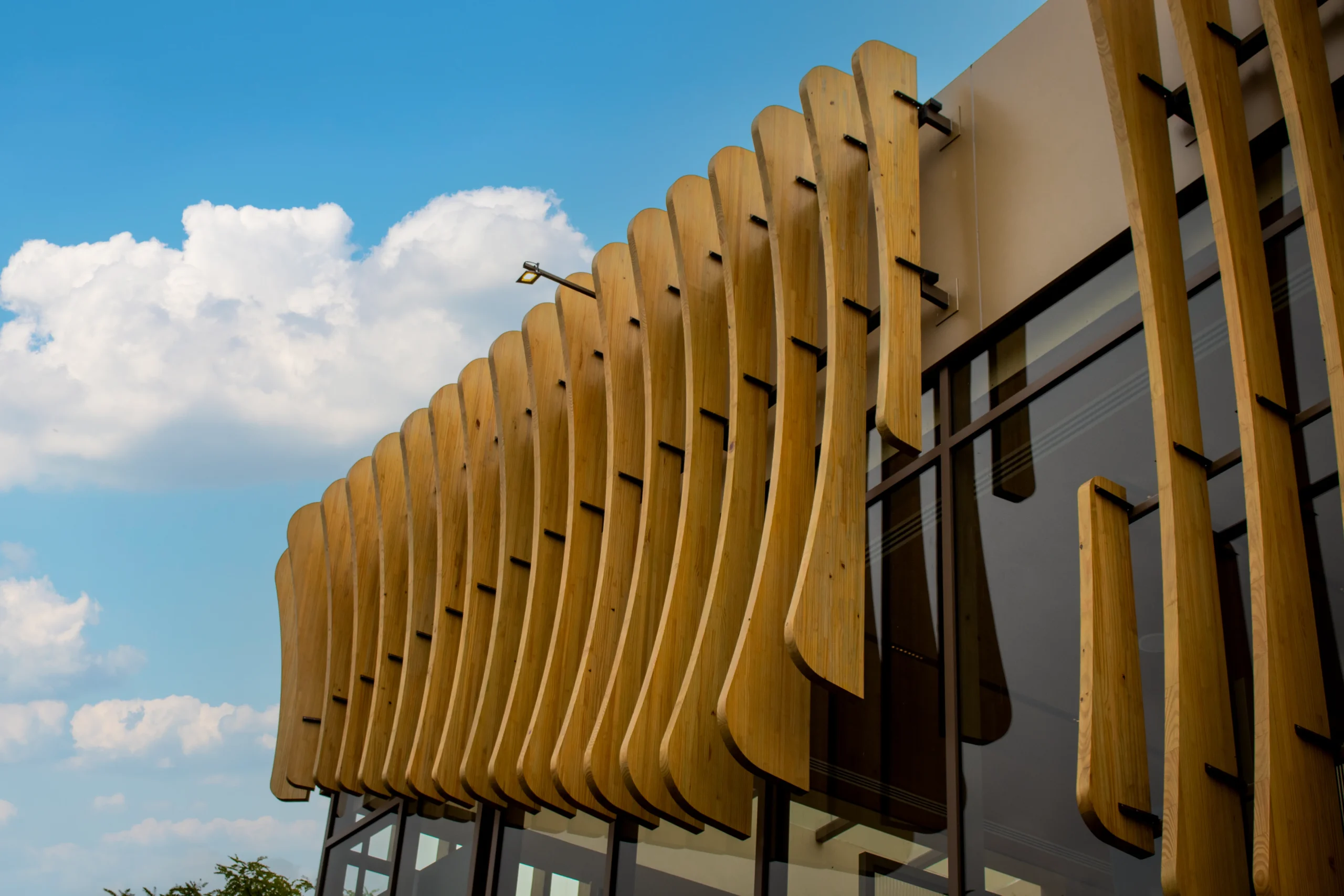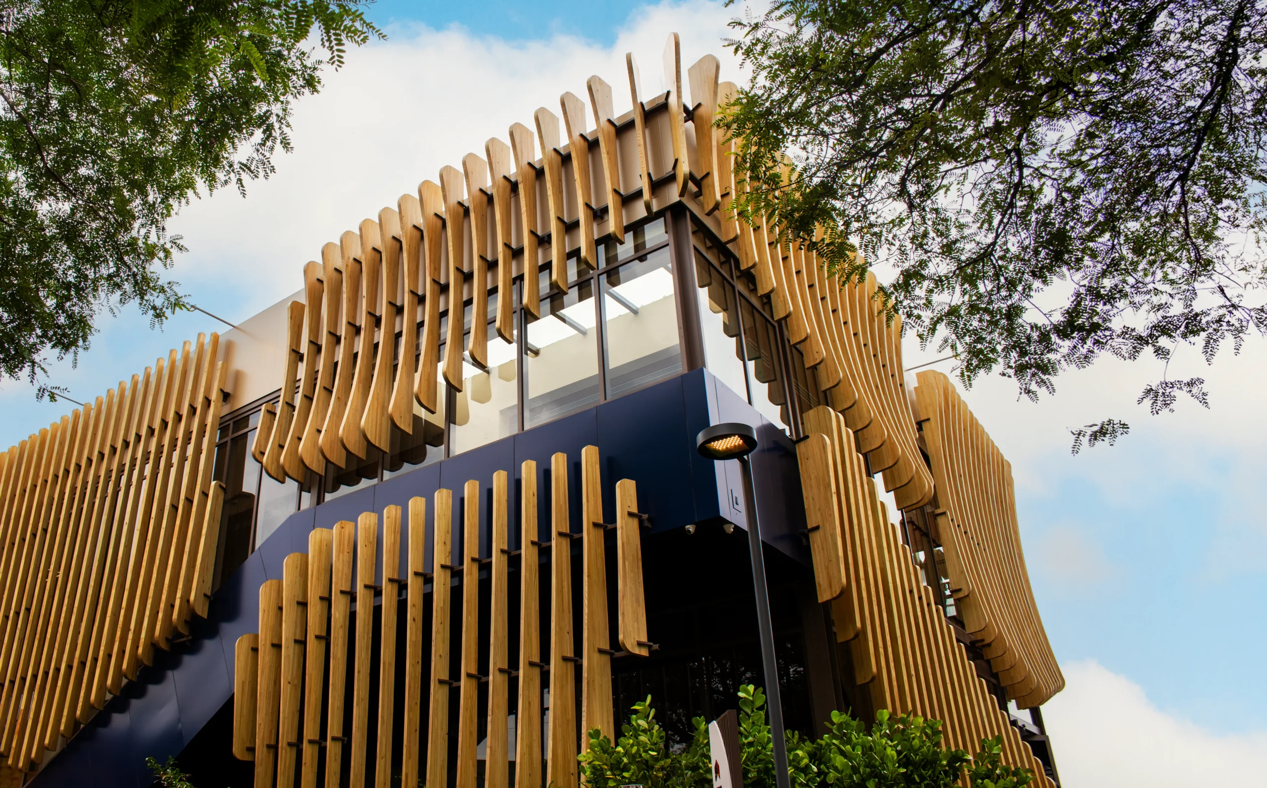 A arquitetura se destaca pela volumetria expressiva e pelo uso da madeira engenheirada em elementos de fachada. Com cerca de 30 m³ de MLC aplicados em vigas curvas, o projeto explora formas orgânicas que criam movimento e identidade visual, ao mesmo tempo em que reforçam a leveza e a precisão construtiva. Os brises e a estrutura contribuem para uma experiência espacial mais fluida, conectando interior e exterior de forma contínua.