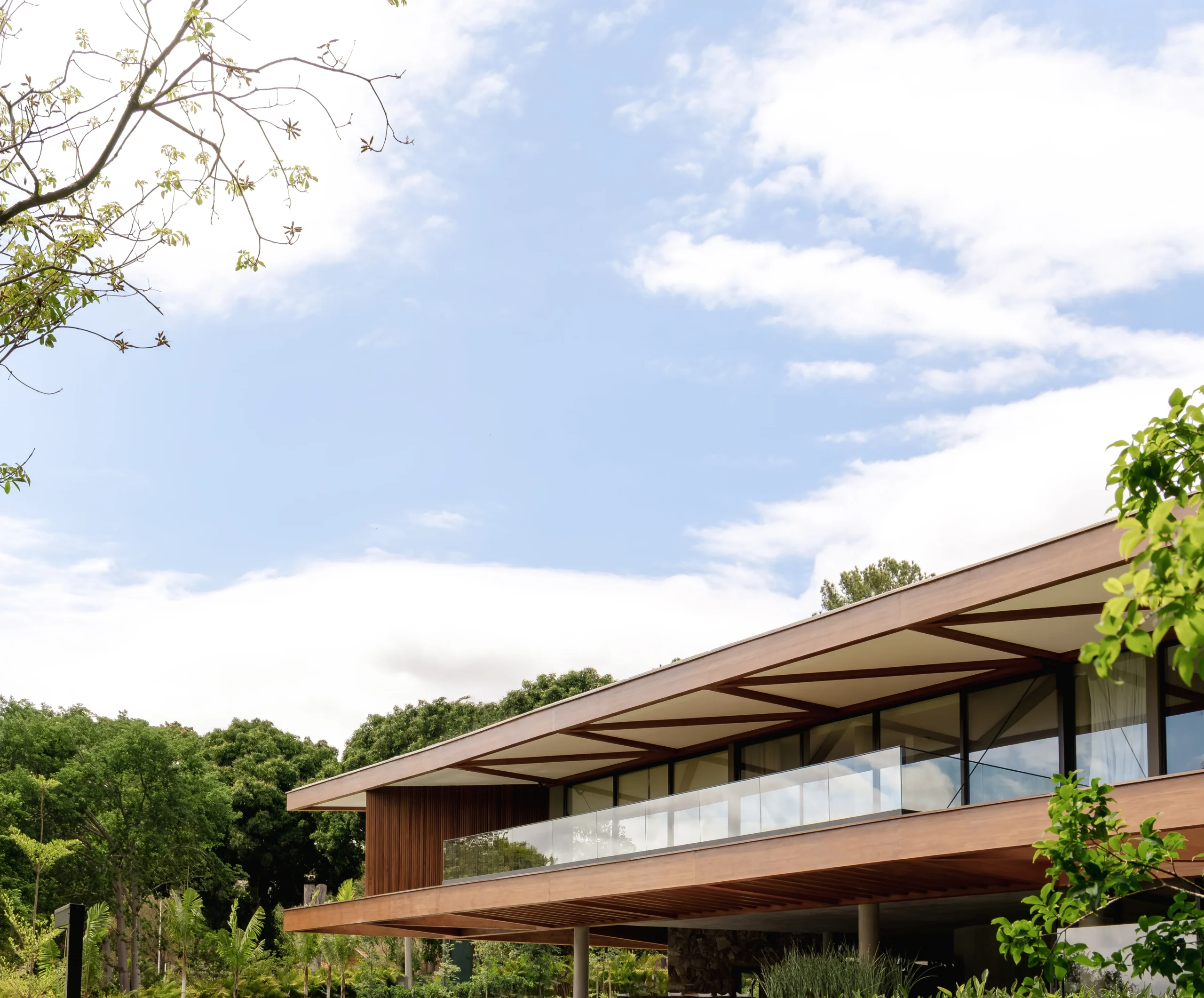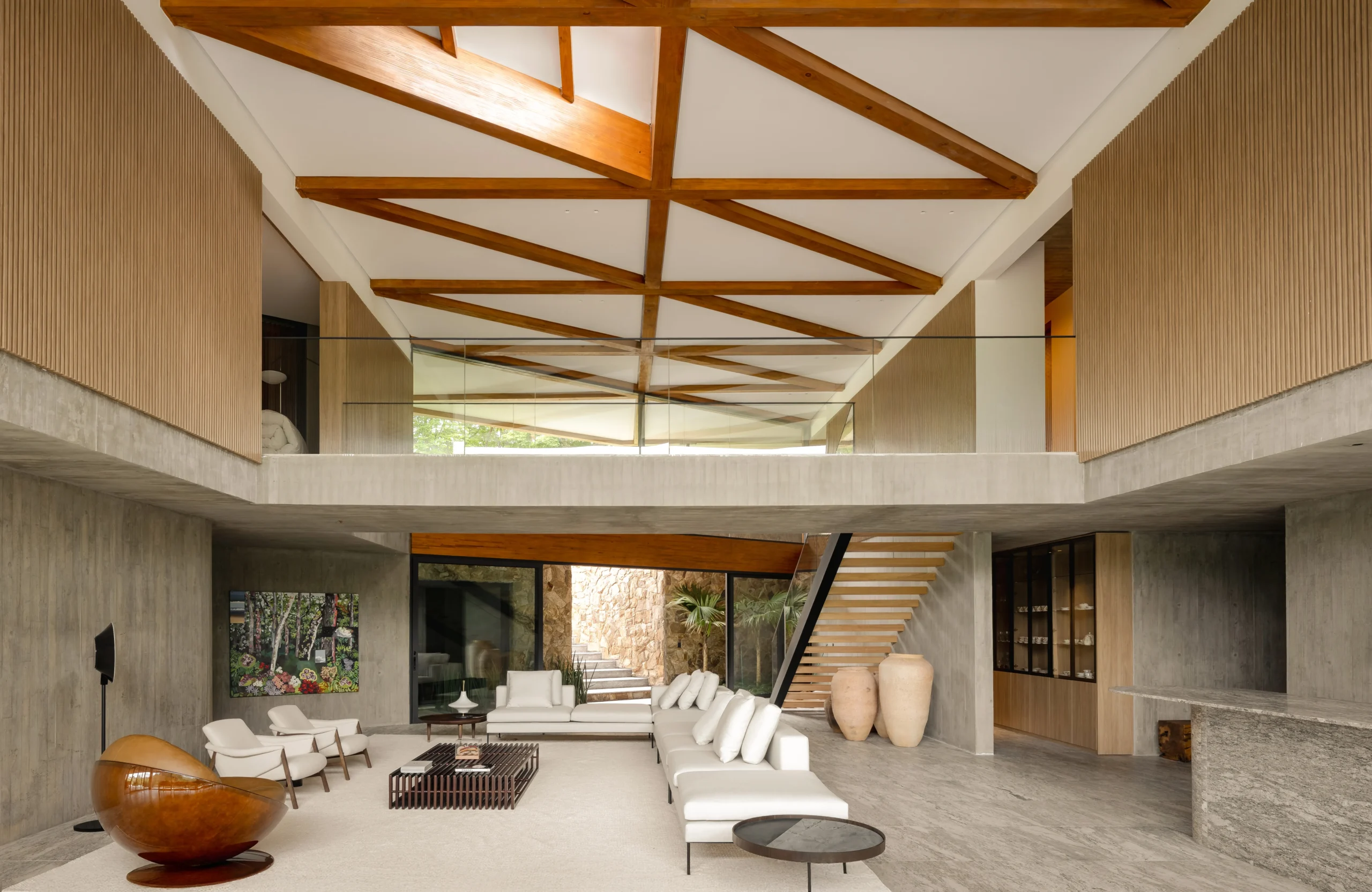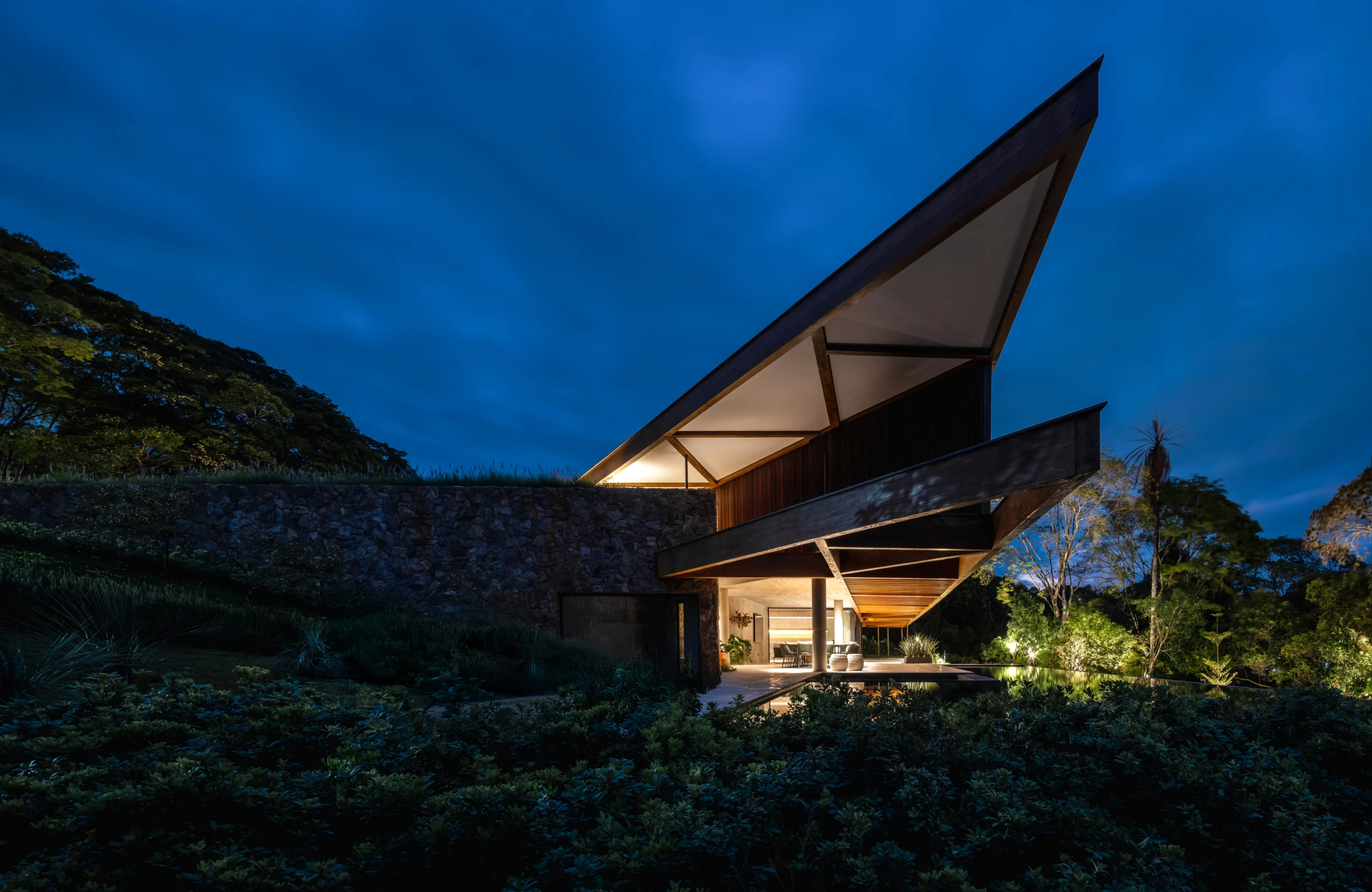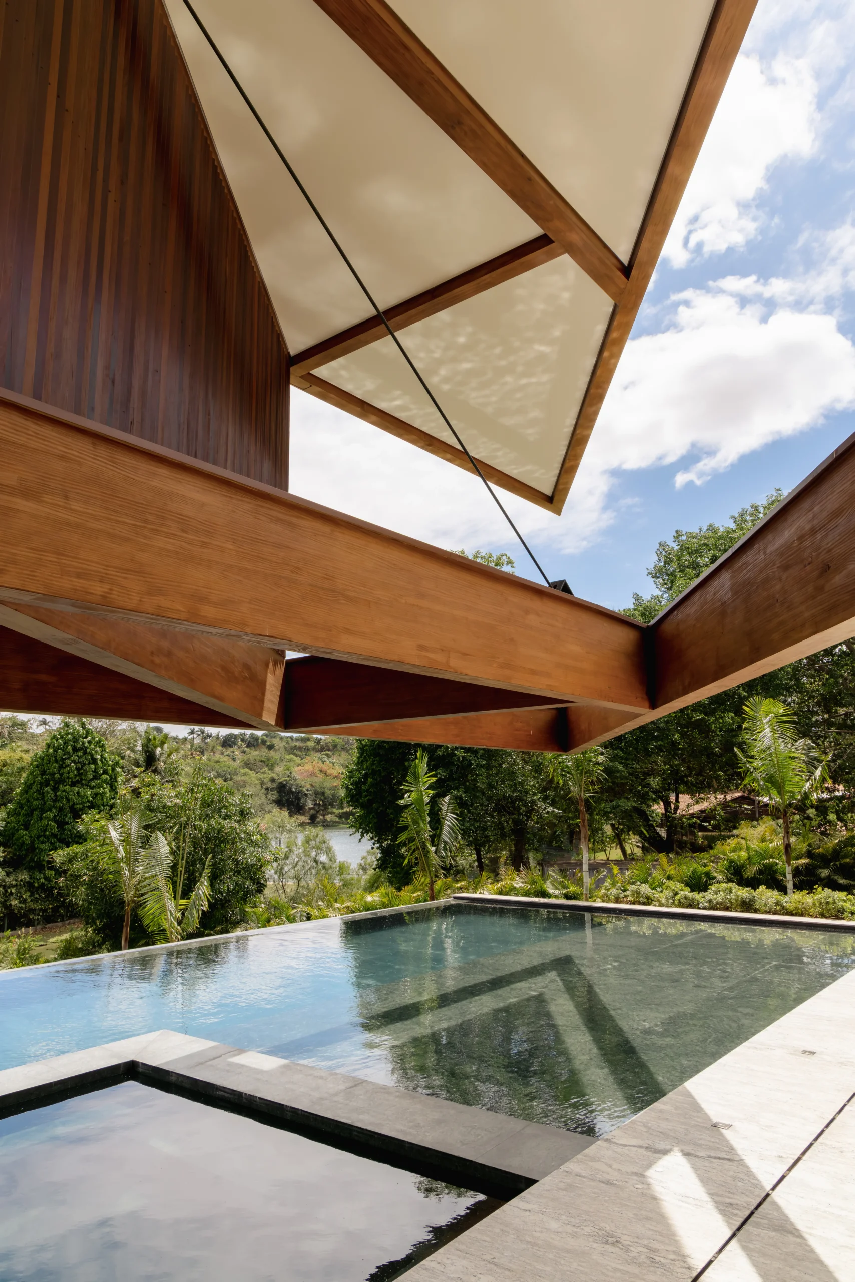 O projeto é estruturado a partir de uma geometria triangular, que orienta a cobertura em madeira laminada colada (MLC). Composta por planos inclinados, essa cobertura funciona como um grande abrigo, fechando-se para a rua e se abrindo completamente para o lago. A estrutura mista combina a leveza da madeira nas coberturas e varandas com a solidez do concreto aparente, equilibrando desempenho e expressão arquitetônica.