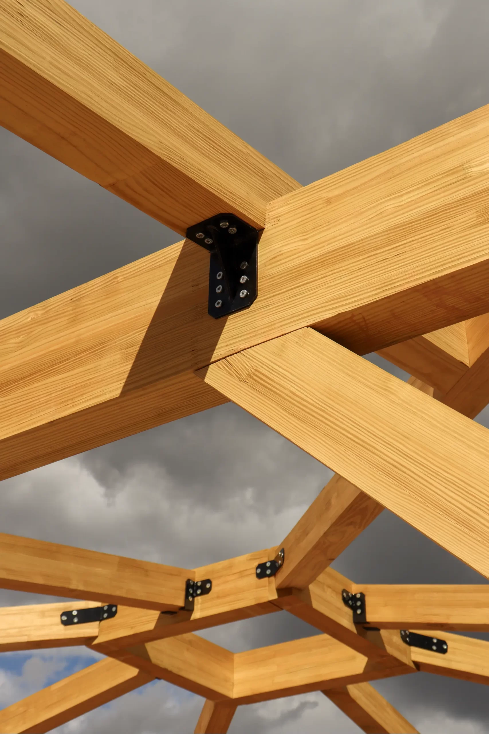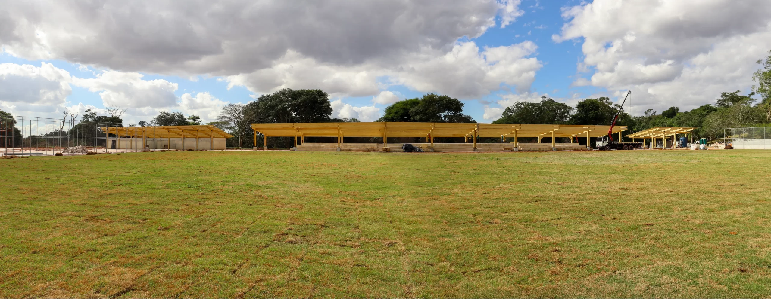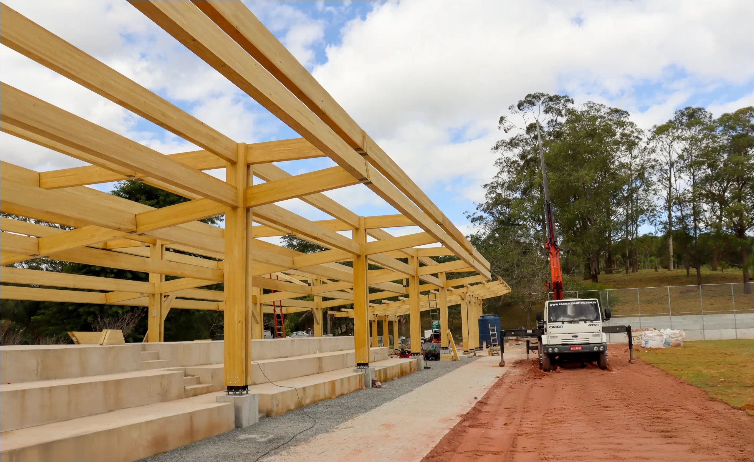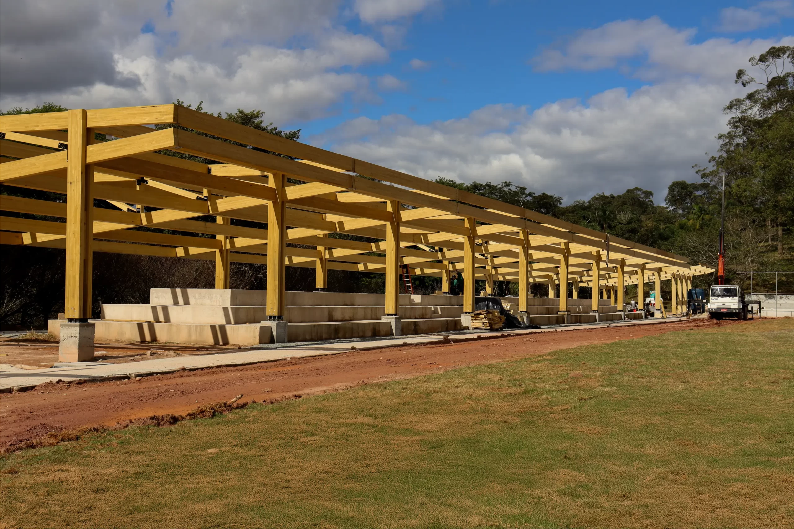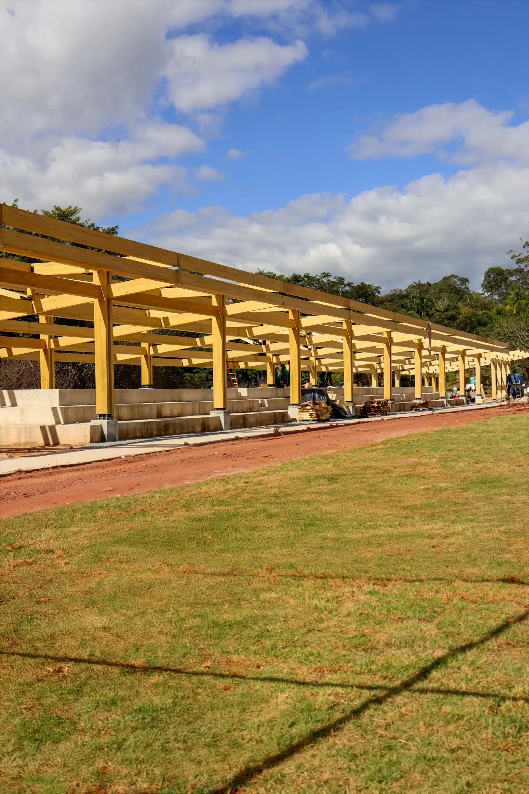 São 1.445 m² de área estruturada em madeira, distribuídos entre dois quiosques, um vestiário, a cobertura da arquibancada e um acesso amplo. A leveza do material permite soluções arquitetônicas mais abertas, integradas e com menor demanda de fundações, além de oferecer excelente desempenho estrutural e durabilidade, com proteção contra pragas e umidade.