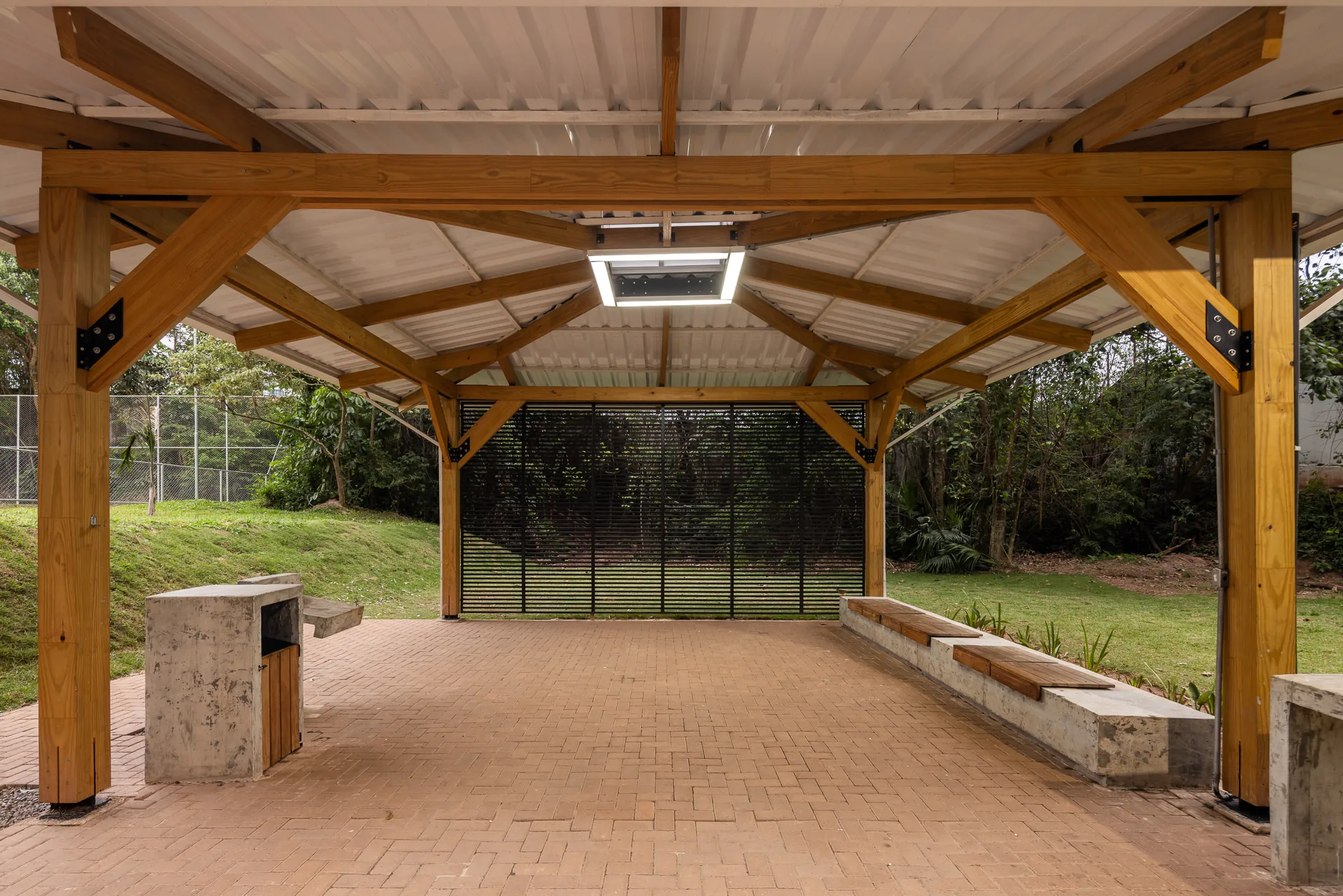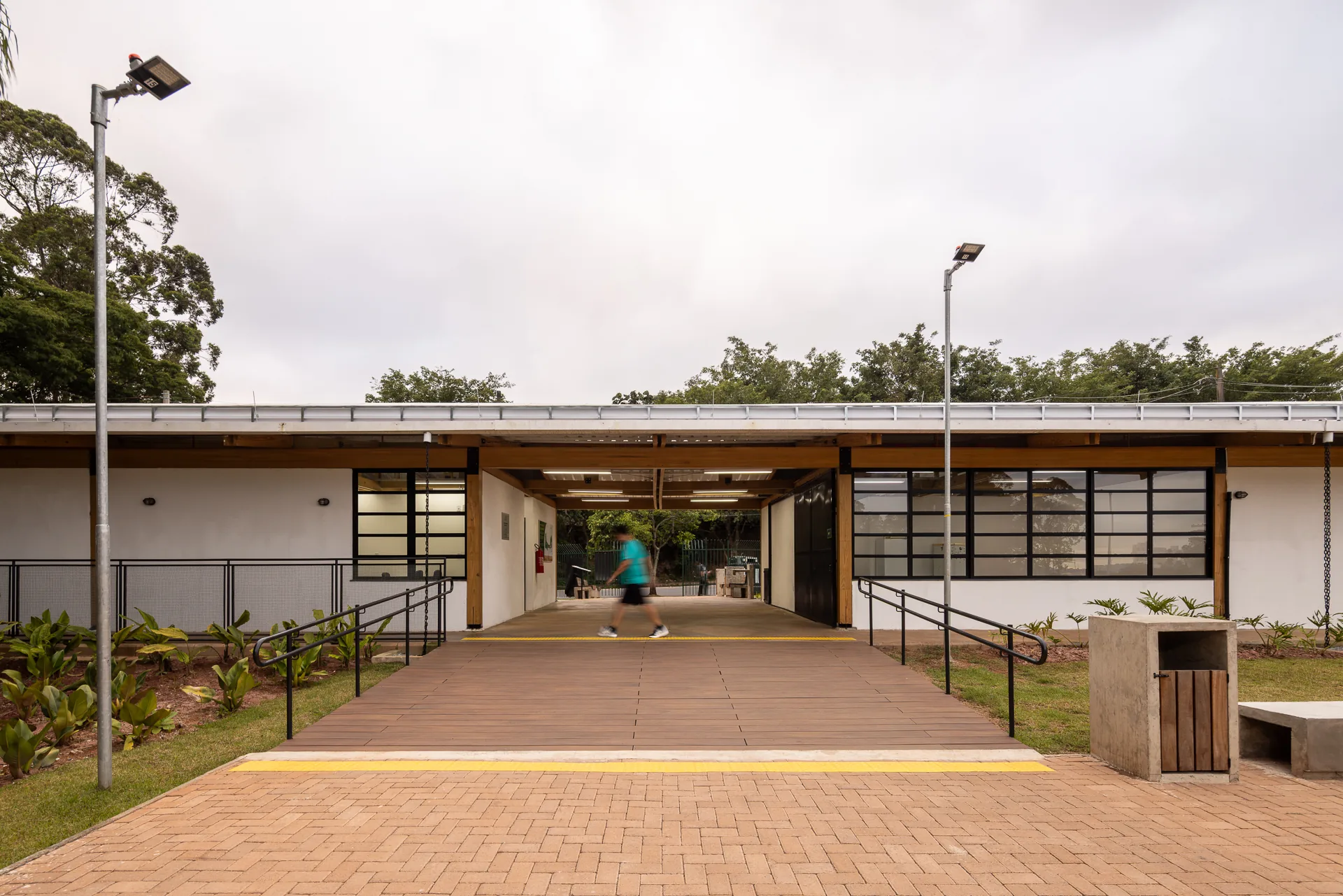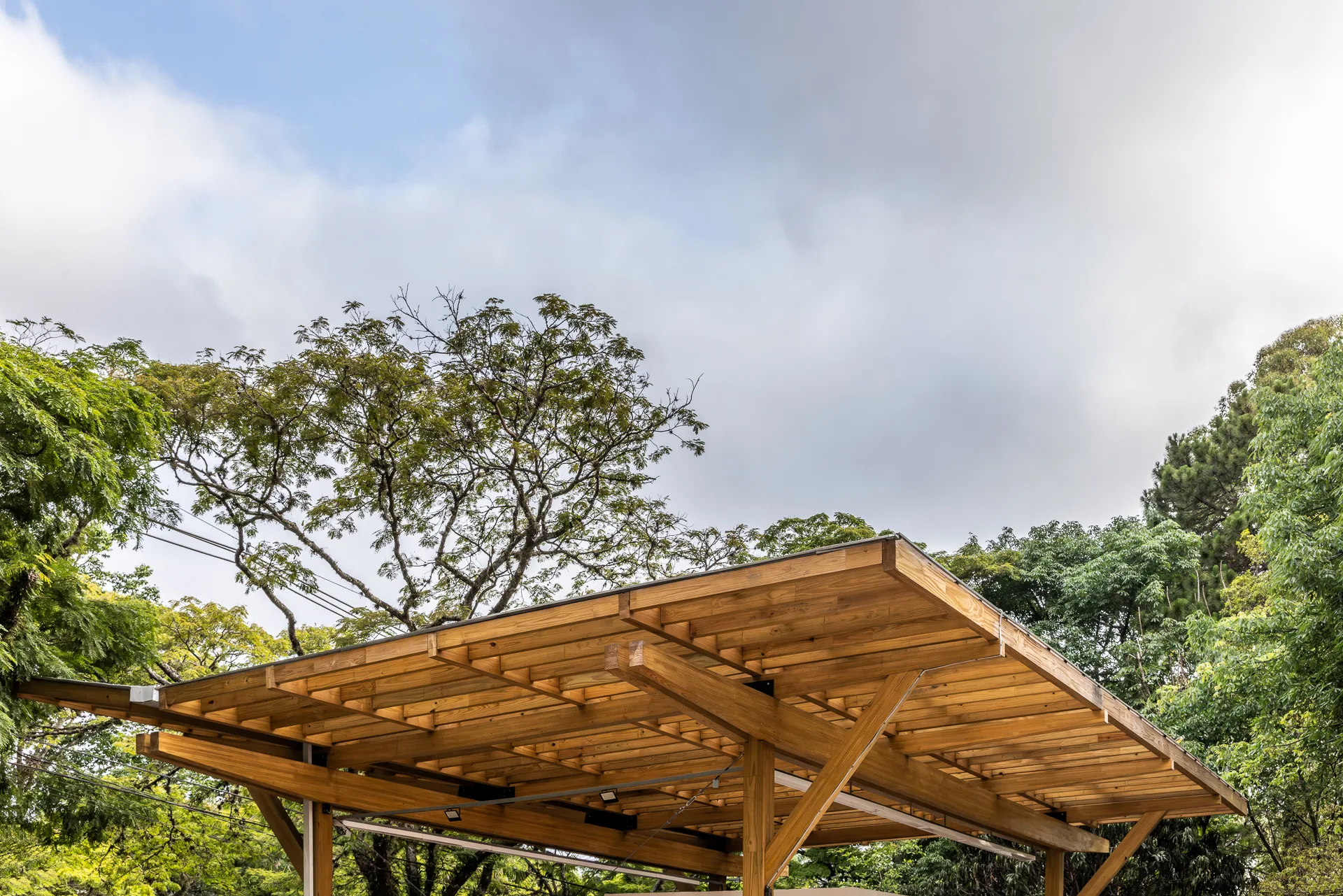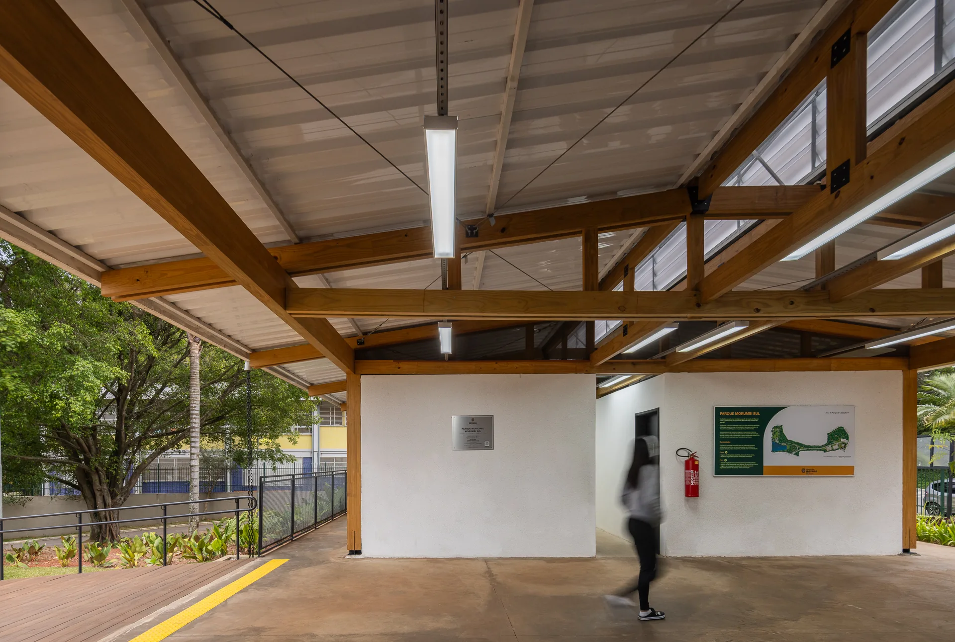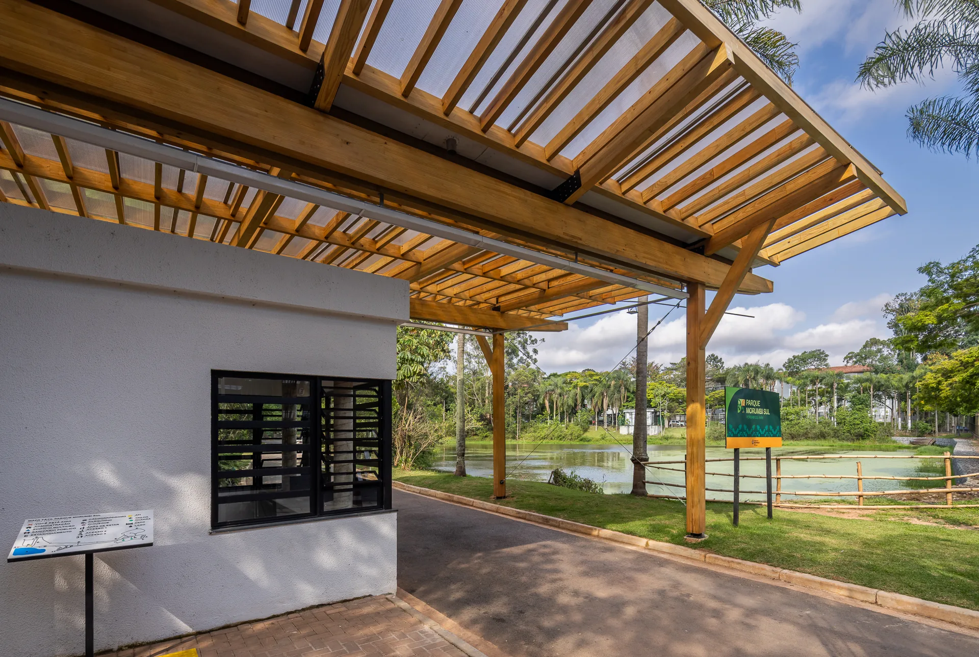 Com cerca de 84 mil m² de área requalificada, o parque ganhou estruturas como pavilhão multiuso, passarelas elevadas, guaritas, academia, quadras e parquinho — todas acessíveis e pensadas para o conforto e segurança da população. O uso do MLC (madeira Lamelada Colada) nas portarias, quiosques e pavilhão administrativo trouxe leveza, eficiência e sustentabilidade ao projeto.